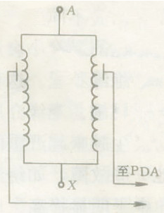(4)PDA監(jiān)測(cè)法。PDA是局部放電分析儀英文名稱(Partial Discharge Analyzer)的縮寫。PDA監(jiān)測(cè)法由加拿大Ontaio Hyaro公司于70年代提出,主要用于在線監(jiān)測(cè)水輪發(fā)電機(jī)的局部放電。它利用繞組內(nèi)放電信號(hào)和外部噪音信號(hào)在繞組中傳播時(shí)具有不同特點(diǎn)來抑制噪聲,提取放電信號(hào),原理圖如圖2-158所示。若水輪發(fā)電機(jī)每相為雙支路(或偶數(shù)支數(shù))對(duì)稱繞組,則在每條支路(在水輪機(jī)的端部的環(huán)形母線上)永久性地裝兩個(gè)耦合電容器,將兩對(duì)耦合電容器的輸出信號(hào)利用相同長度的電纜引至PDA輸入差分放大器。對(duì)于外部噪聲信號(hào),每相繞組的兩個(gè)信號(hào)耦合電容器,將產(chǎn)生相同的響應(yīng),因而PDA的差分放大器無輸出,噪聲被抑制。對(duì)于內(nèi)部放電信號(hào),由于信號(hào)傳播距離不同,在到達(dá)每相繞組的兩個(gè)耦合電容器時(shí)將出現(xiàn)時(shí)差,耦合電容器所取得的信號(hào)也將出現(xiàn)相對(duì)時(shí)延,差分放大器的輸出就是放電信號(hào)。PDA試驗(yàn)法在國外水輪發(fā)電機(jī)的在線監(jiān)測(cè)中已被采用。